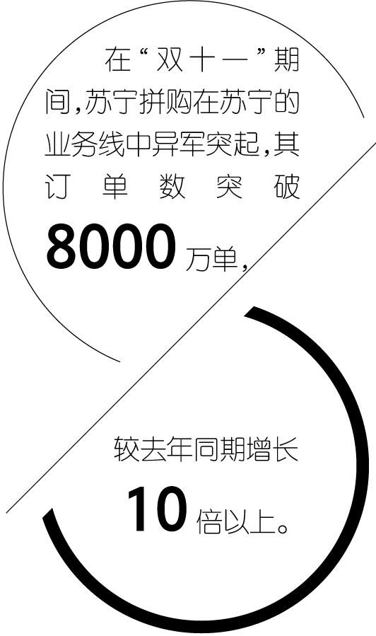 在“双十一”期间,苏宁拼购在苏宁的业务线中异军突起,其订单数突破8000万单,较去年同期增长10倍以上,并且发展新买家2100万,三四级市场渗透率达56%。