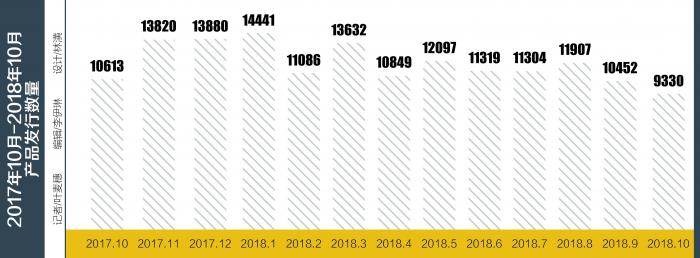 10月份银行理财产品共发行9330款,环比减少1122款,环比降幅为10.73%,同比降幅则为12.09%。银行理财产品发行量为两年来的最低值,上次月发行量跌破1万只的时间节点是2016年10月。