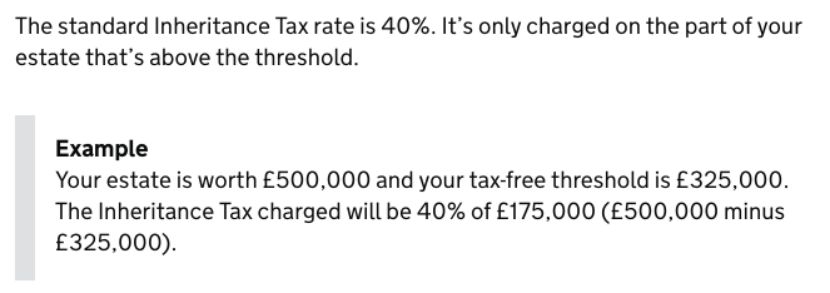 再看英国方面,查阅英国政府官网发现,英国标准的遗产税税率为40%,需要缴纳遗产税的门槛数额为32.5万英镑,这意味着若继承人继承的遗产价值为50万英镑,那么需要缴纳的遗产税则为17.5万英镑