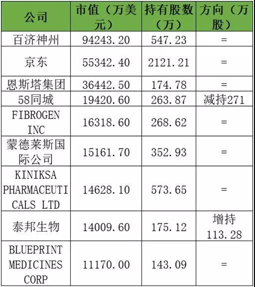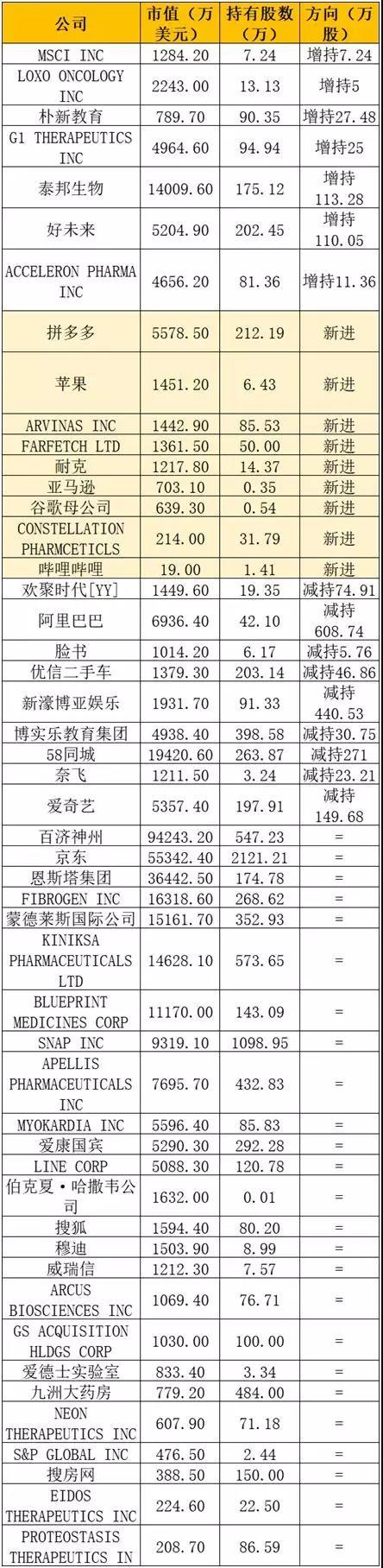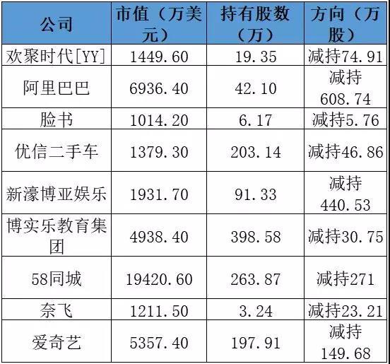 此外,减持奈飞近九成仓位、减持欢聚时代近八成仓位,爱奇艺、Facebook、58同城分别斩仓40%-50%。