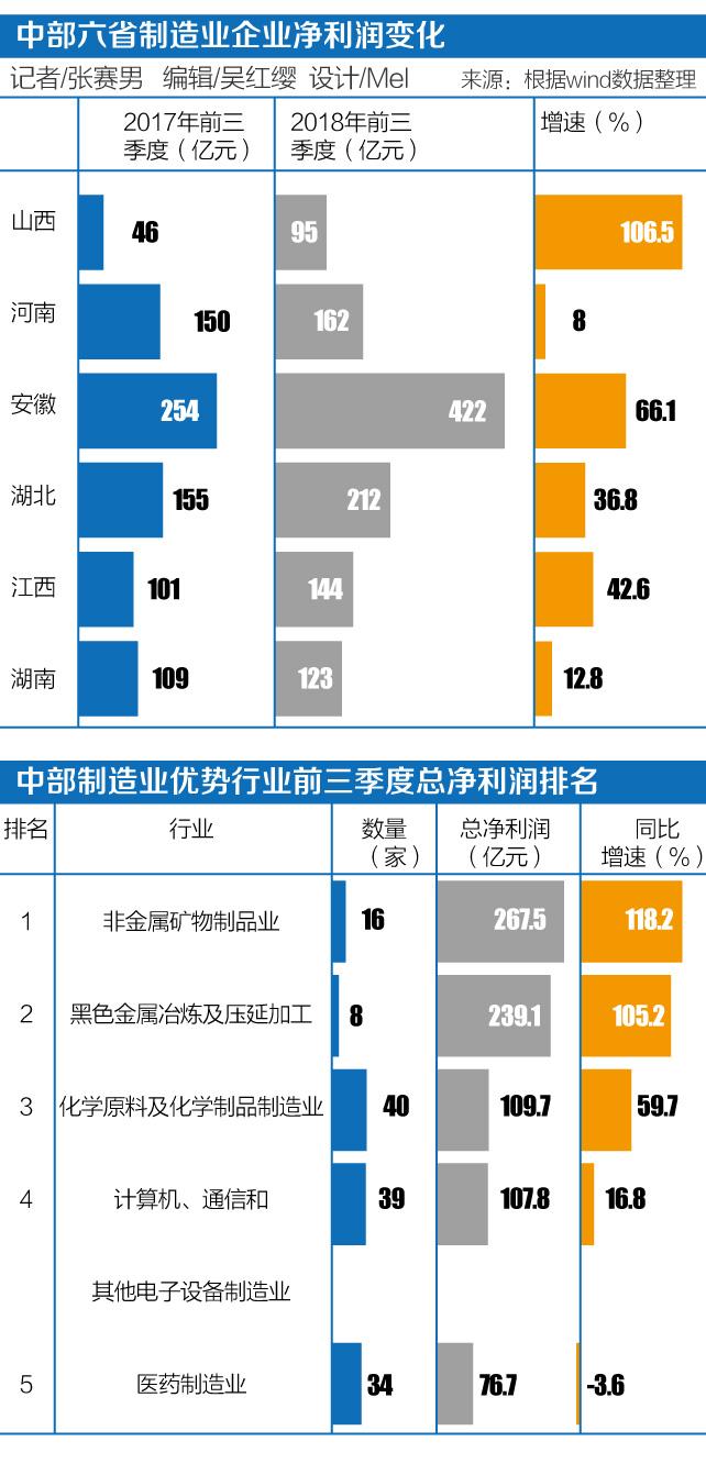 上述行业净利润总额占据中部地区半壁江山,增速也分别高达118.2%、105.2%、59.7%。