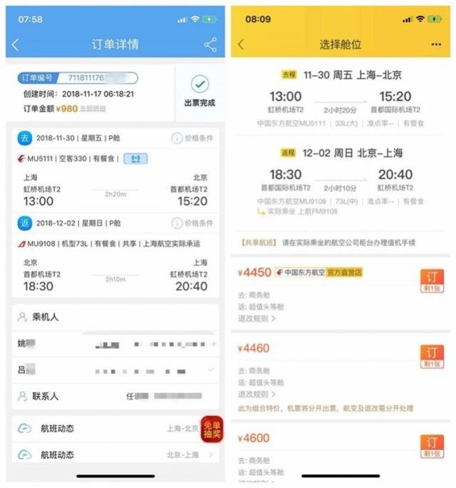 左图为任先生购买的两套往返京沪的东航头等舱票价。右图为同期担任头等舱价格。来源:受访者供图