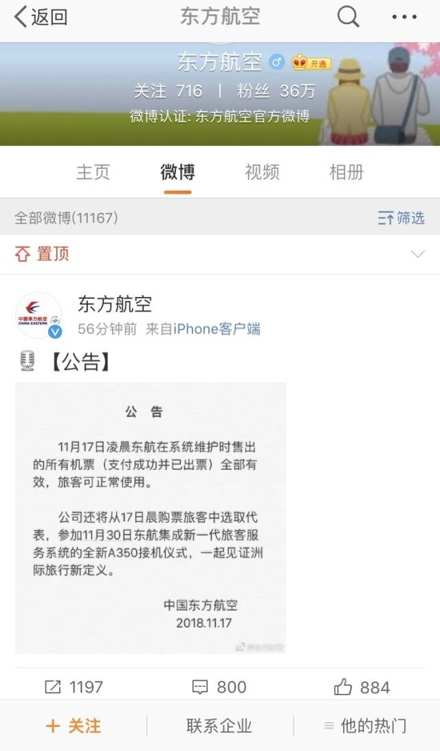 就在部分网友担忧能否正常出票时,11月17日中午,东航通过官方微博发布公告,称11月17日淩晨东航在系统维护时售出的所有机票(支付成功并已出票)全部有效,旅客可正常使用。此外,东航还将从17日晨购票旅客中选取代表,参加11月30日东航集成新一代旅客服务系统的全新A350接机仪式。