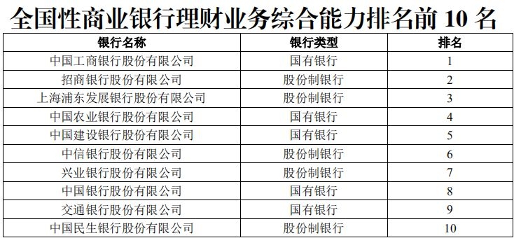 报告显示,2018年上半年,全市场理财业务综合能力排名前十的银行依次是:工商银行、招商银行、浦发银行、农业银行、建设银行、中信银行、兴业银行、中国银行、交通银行、民生银行。
