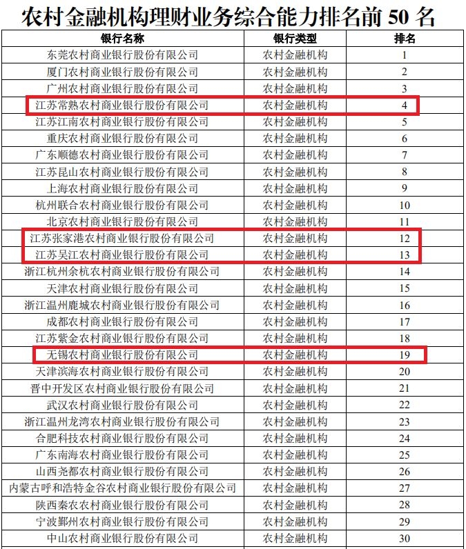 而在A股上市的5家农村商业银行中,常熟银行、无锡银行、吴江银行、张家港行在农村金融机构理财业务综合能力排名中均进入前20。