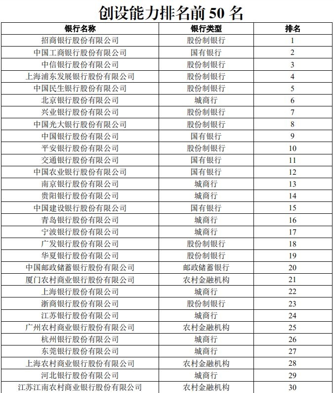招商银行勇夺创设能力冠军,工行屈居第二,前五位其他三席均为股份制银行,前十名中股份制银行占据7位。除工行外,国有银行仅中行进入前十,位居第9名。