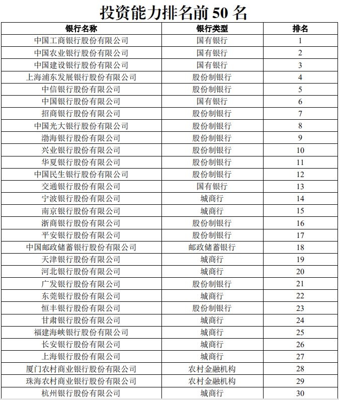从投资能力来看,国有银行和股份银行也算平分秋色。前十名中,虽然国有银行仅占据4席,但排名更靠前。工行、农行、建行承包了前三名,中行位居第6。