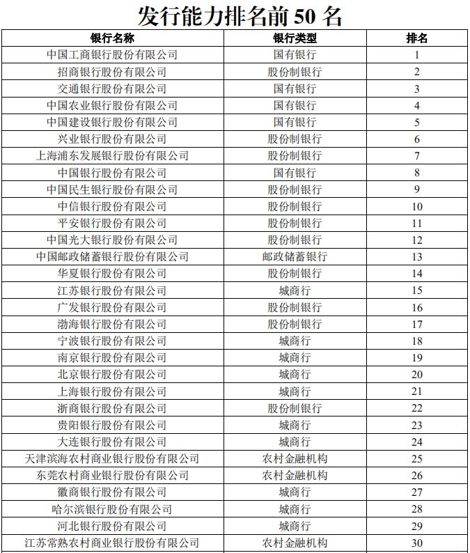 从发行能力来看,前十名被国有银行和股份制银行对半瓜分,但国有银行显然排名更靠前。工行居首,交行、农行、建行分列三、四、五位,前五中占据4席。