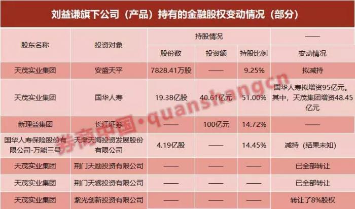 刘益谦的金融版图覆盖投资、保险、证券等多个领域。此番拟减持安盛天平的同时,天茂集团亦拟巨资增资国华人寿,2015年投资百亿元的长江证券目前浮亏超一半,其后续走势值得关注。此前国华人寿—万能三号曾持有天海投资14.45%股权,系天海投资第二大股东,在2017年1月,天茂集团曾公告拟2年内完成减持。