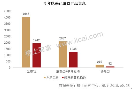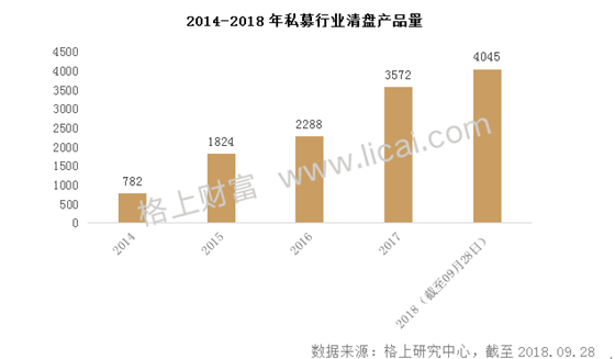据格上理财数据显示,截至2018年9月30日,今年前三季度,全市场私募产品清盘达到4045只,涉及机构1942家,最多的共清盘旗下产品44只。从历史数据来看,2014~2017年全市场私募产品清盘数分别为782只、1824只、2288只、3572只,而今年前三季度总清盘数已创出了5年来新高。在这些清盘的私募产品中,股票策略私募产品清盘数就有2087只。