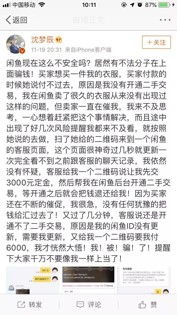 沈梦辰还详细地贴出了被骗的全过程,并提醒大家千万不要像自己一样上当。