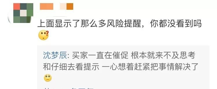 沈梦辰的答复是:买家一直在催促,根本就来不及思考和仔细去看提示, 一心想着赶紧把事情解决了。