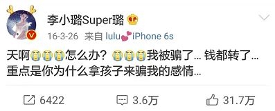 李小璐意识到受骗,“心塞”发微博:“天啊,怎么办?我被骗了……钱都转了……重点是你为什么拿孩子来骗我的感情……”