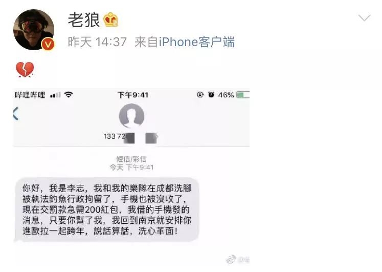 比如老狼19日就转发了一张诈骗短信的截图,配上心碎的表情。