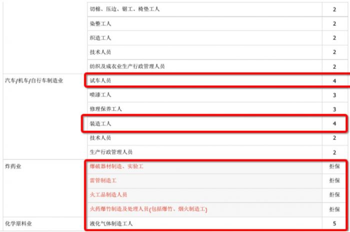 4级以及以上的职业或者拒保职业如炸药行业、电缆行业工人: