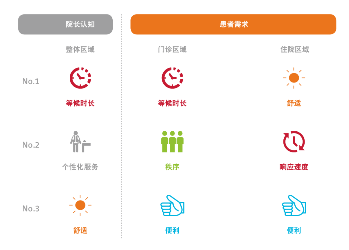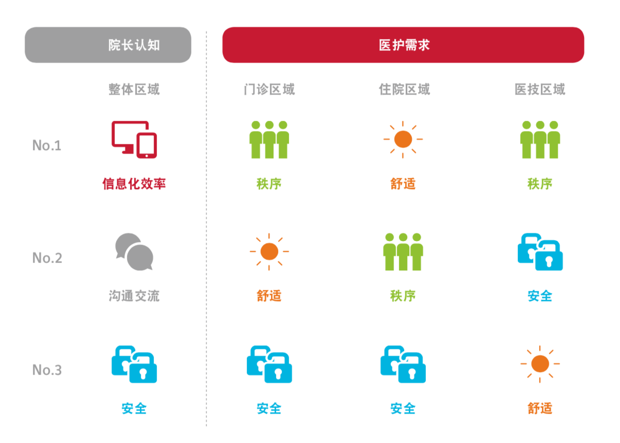 另外,医院管理层对于医患的需求认知与医患真实需求之间存在一定偏差,医患人员在不同区域的需求存在明显差异。