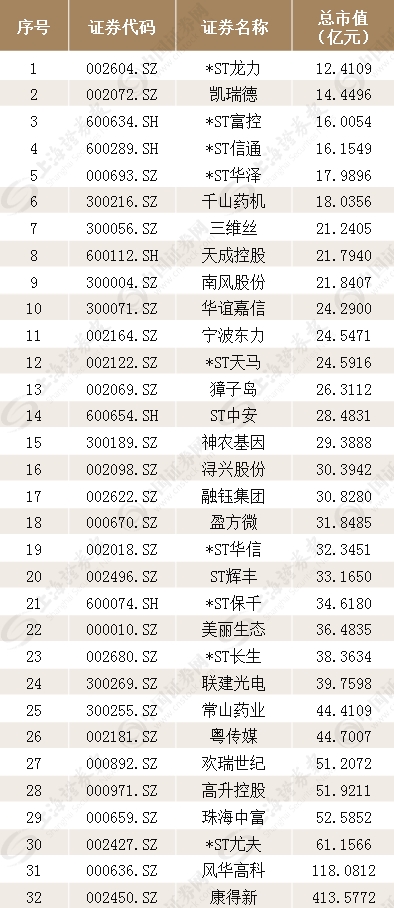 从总市值上看,19日收盘后,32家公司中有25家在40亿以下,市值最小的*ST龙力只有12.4亿元。