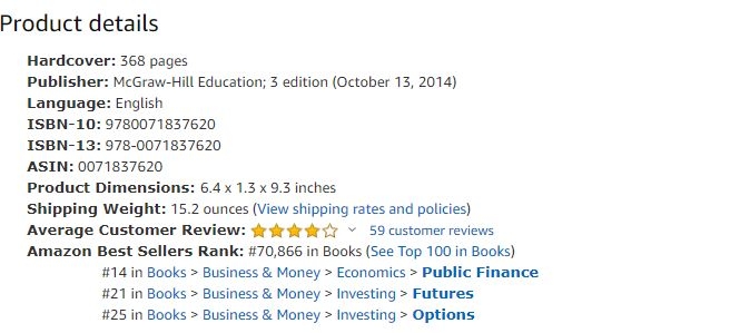 可别小看了他,他写的书可是由麦格劳·希尔公司,一家主要出版教科书的出版社(相信许多阅读原版教科书的同学不会陌生)出版的,而且书都出到了第3版(只有卖的好的书才会持续更新内容),书籍在亚马逊上的评论还不错:除了有四星评级以外,在金融、期权等书籍的排名都在前30名。