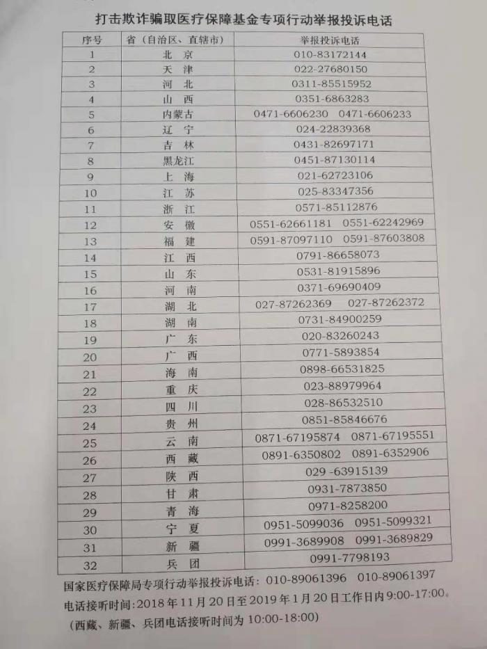 发布会现场,有关负责人发布了打击欺诈骗取医疗保障基金专项行动举报电话,为010-89061396和010-89061397。另外,各省、自治区、直辖市的举报投诉电话,也于发布会上公布,如下图。