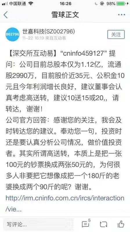 炒作高送转,早就不断被诟病,本质上就是把一张100元的钞票换成两张50元的,可偏偏时常吸引炒作资金,世嘉科技董秘就对投资者“以诚相待”。