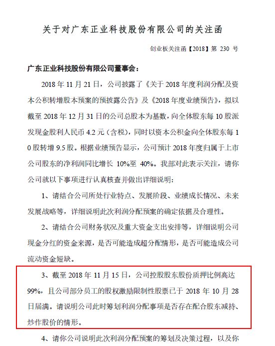而21日晚间,正业科技发布高送转,今日深交所创业板公司管理部就对正业科技也发布了关注函。关注函称,截至2018年11月15日,公司控股股东股份质押比例高达 99%,且公司部分员工的股权激励限制性股票已于2018年10月28日届满。请说明公司此时筹划利润分配事项是否存在配合股东减持、炒作股价的情形。