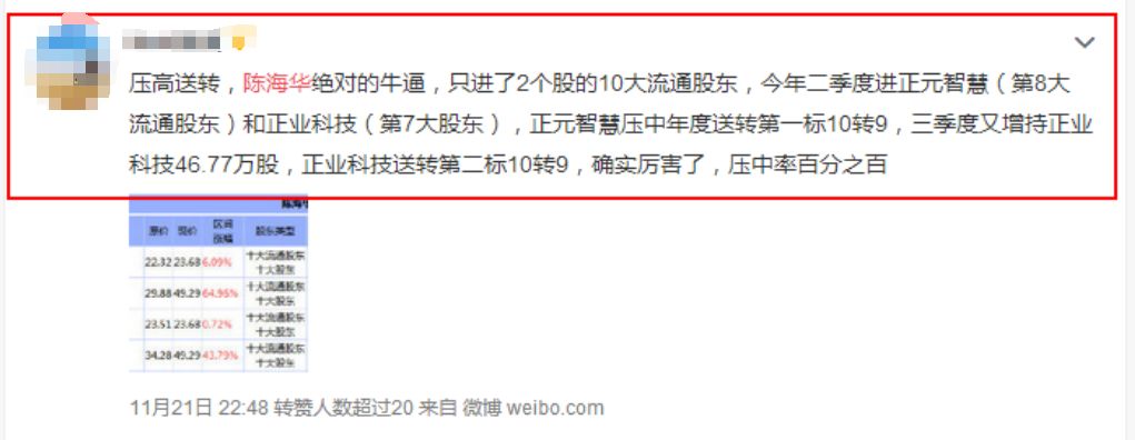巧合的是,三季报显示,陈海华一共只进入2只股票的十大流通股东,然而2只居然都高送转,押中概率100%。
