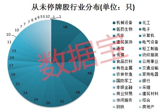 分行业看,未停牌股主要分布在机械设备、化工、医药生物、电子、汽车等行业,其中机械设备行业分布最广,有58只个股。房地产、钢铁、综合行业分布较少,分别只有2只、1只、1只个股。