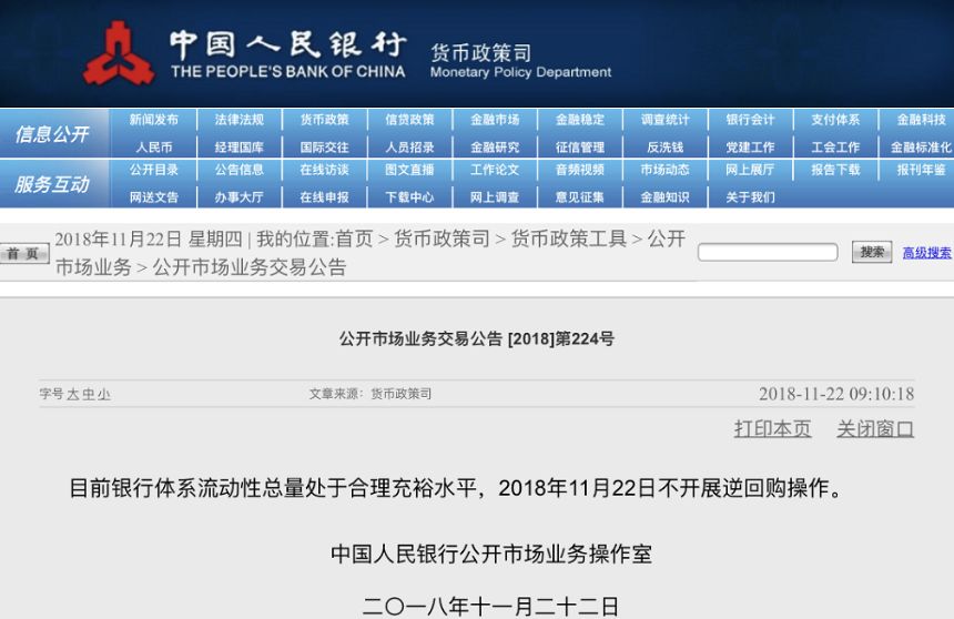 11月22日,央行发布公告称,目前银行体系流动性总量处于合理充裕水平,当天不开展逆回购操作。同时,当日也无逆回购到期。值得注意的是,这是央行连续20个交易日未开展逆回购操作,刷新了2016年初央行宣布增加公开市场操作频率至每个工作日以来的新高。