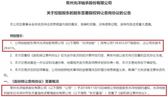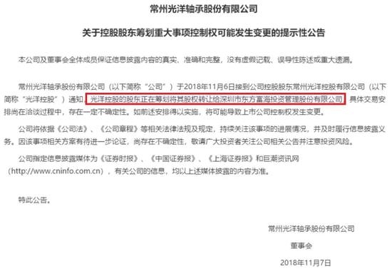 公告称,公司11月6日接到控股股东光洋控股通知,称其股东正在筹划将股权转让给深圳市东方富海投资管理股份有限公司,可能导致公司控制权变更。