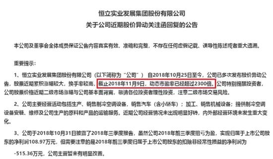 在11月12日对深交所异动关注函的回复中,恒立实业称,公司此前已多次发布股价异动公告,截至11月9日,其动态市盈率已经超过2300倍,股票涨幅与基本面背离。