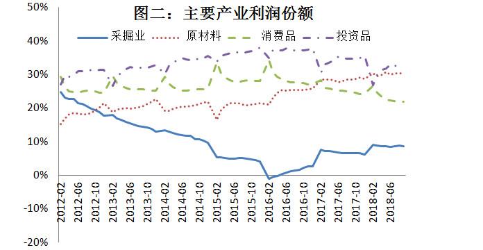 我们把统计局公布的制造业29个子行业重组成原材料、消费品和投资品三大类,并结合采掘业进行产业比较。图二数据显示,近两年消费品和投资品等中下游企业部门在全部规模以上工业企业的利润占比呈下行趋势,而原材料和采掘业呈上行趋势。