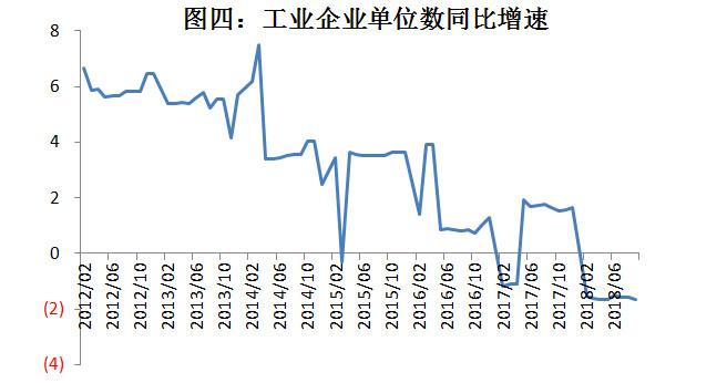 除了利润数据,我们还可以参考规模以上工业企业的数量变化来分析工业整体和结构的变化。如图四显示,自2012年以来,工业企业的数量增速一直呈回落态势,这和经济增速下台阶有关,也和各产业的集中度提升有关。但2018年以来,规模以上工业企业数量却出现了罕见的持续负增长。这意味着有至少1.6%左右的原规模以上企业的销售收入在今年掉到2000万以下。