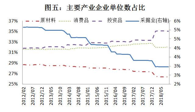进一步分析企业数量的结构,我们发现,虽然近年原材料和采掘业的利润占比上行,但企业数量占比却在持续下滑。这意味着原材料和采掘业的集中度在快速提升。相比之下,代表复杂制造业的投资品行业的集中度却相对下滑。