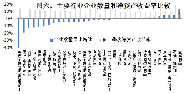 综合比较各主要工业行业的企业数量和净资产收益率,我们看到大部分的原材料和采掘业单位数都出现了两位数的下滑,其中黑色金属冶炼业单位数同比负增长近40%。然而,企业数量减少较多的行业净资产收益率普遍高于整体平均,而企业数量增加较多的行业净资产收益率却普遍较低。按照我们通常的理解,由于资本会流向高回报的产业,因此企业数量变化和收益率应该是正相关的,但实际情况却并非如此。背后可能的原因是,今年的产业政策通过影响企业的数量间接影响到了部分行业的收益率水平。