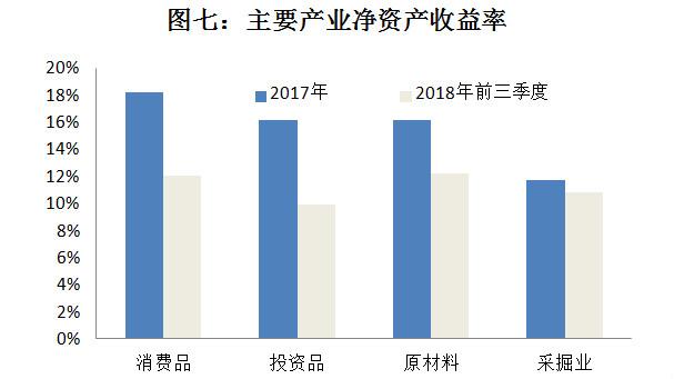 我们再把主要产业的净资产收益率和2017年进行比较。如图七所示,2017年盈利状况领先的消费品和投资品,在2018年都出现了相对下滑。至三季度末,投资品的盈利水平处于各产业的低位。如我们前面所述,在市场主导的经济环境下,资本会流向净资产收益率较高的行业。而当前的情况是,高收益率的行业受政策限制不能投,允许投的行业收益率低,这明显抑制了工业企业的投资热情。