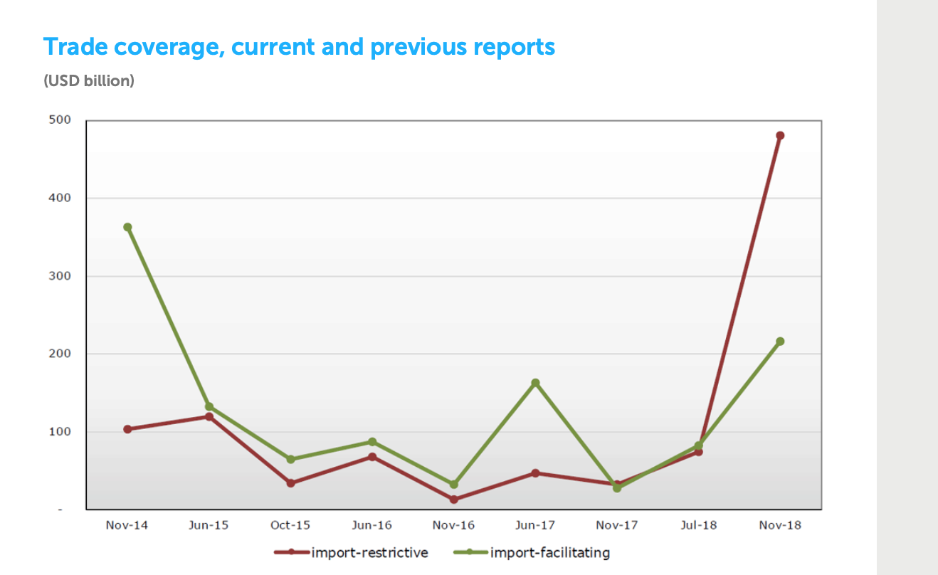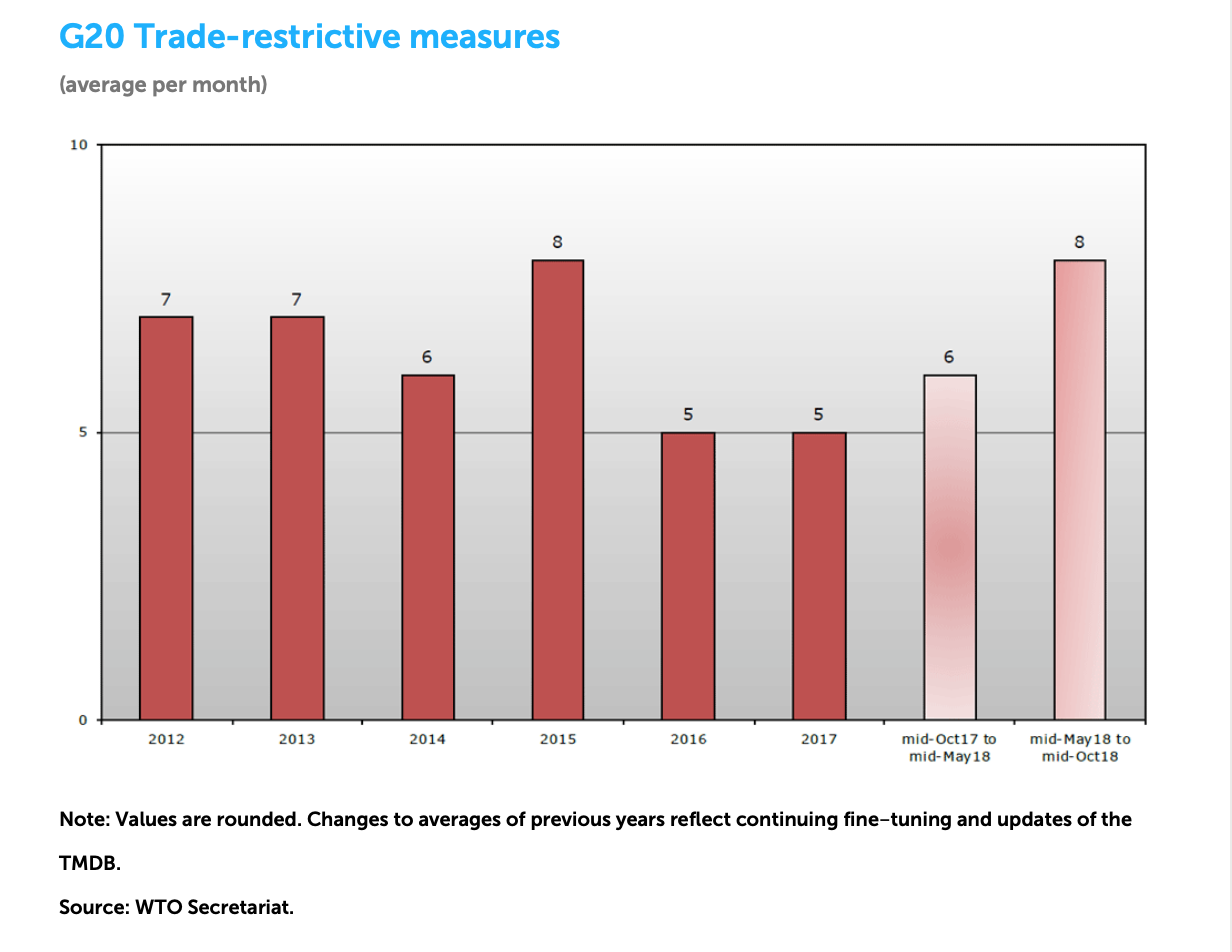 具体来看,在今年5月中到10月中期间,G20国家月均采取8项新的贸易限制措施,包括增加关税、采取进口禁令和出口税负等,而在上一个观察期(2017年5月中旬-10月中旬),G20国家月均采取的新的贸易限制措施数量为6项,涉及贸易的规模为上一观察期的6倍。