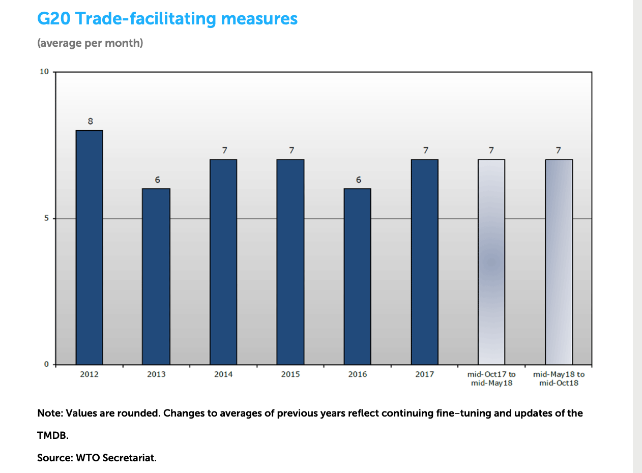该报告也指出,在今年5月中到10月中期间,G20国家新采取了33项贸易便利措施,包括下调/取消进出口关税,月均数量和其他观察期持平。