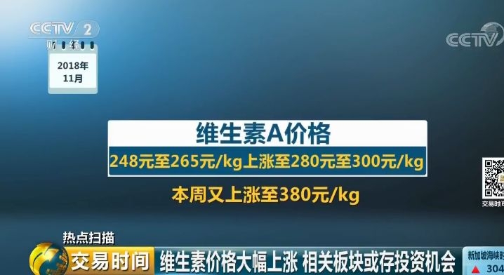 11月以来,维生素A价格由248-265元/kg上涨至280-300元/kg,本周又上涨至380元/kg。