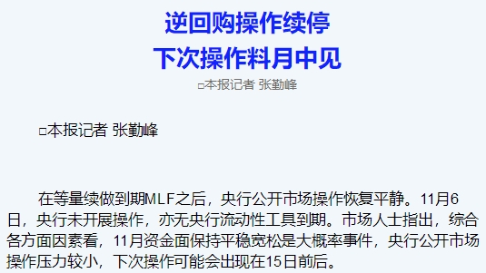 话说月初的时候,中证君在报纸上写了一篇稿子(如下) ,综合市场人士分析后提出一个猜想——11月央行逆回购操作大概率要停到15日前后才可能重启,理由是本月资金面问题不大,而月中企业缴税或导致资金面收紧,最有可能促使央行重启逆回购操作。