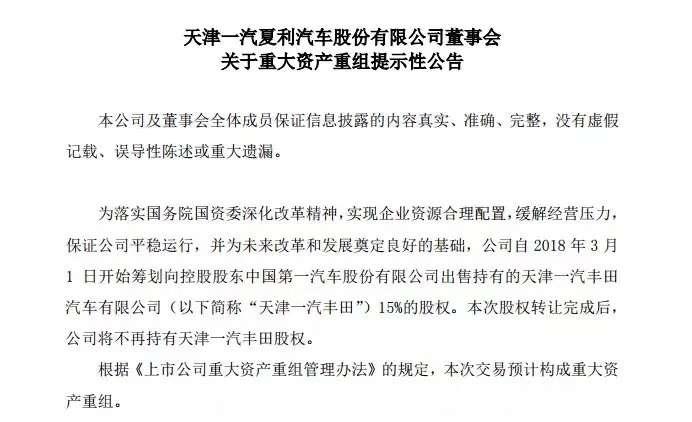 11月23日,天津一汽夏利汽车股份有限公司(000927.SZ,以下简称“一汽夏利”)发布公告,一汽夏利自2018年3月1日开始筹划向控股股东中国第一汽车股份有限公司(简称“一汽”)出售持有的天津一汽丰田汽车有限公司(简称“天津一汽丰田”)15%的股权,本次股权转让完成后,公司将不再持有天津一汽丰田股权。