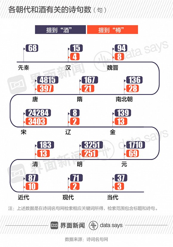 界面数据在诗词名句网检索发现,宋代诗人最爱酒,其作品中提到“酒”字的诗句数超过2.4万句,提到“樽”(酒杯)的诗句数超过3400句。