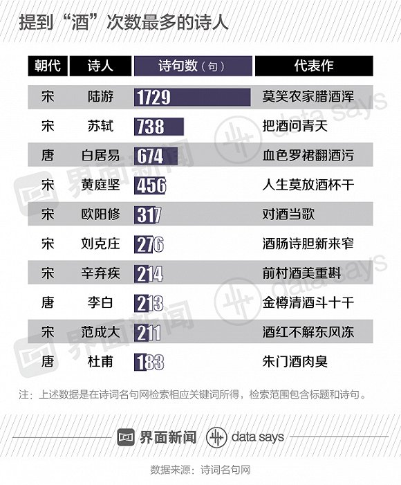 中国历史上最爱写“酒”的诗人其实是陆游,包含“酒”字的诗句数达到1729句;其次是苏轼,为738句。