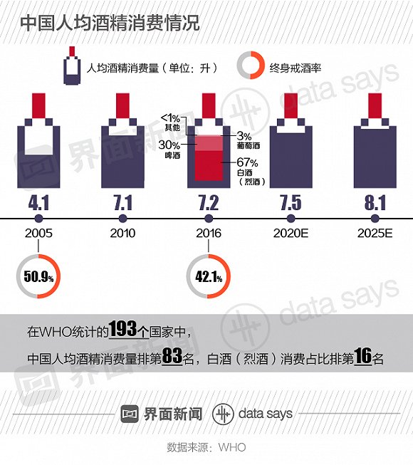 世界卫生组织(WHO)今年9月发布的《2018年酒精与健康全球状况报告》显示,2010年至2016年,全球人均酒精消费量一直维持在6.4升;中国人均酒精消费量则始终保持上涨,2016年已达7.2升,其中白酒占比近七成。