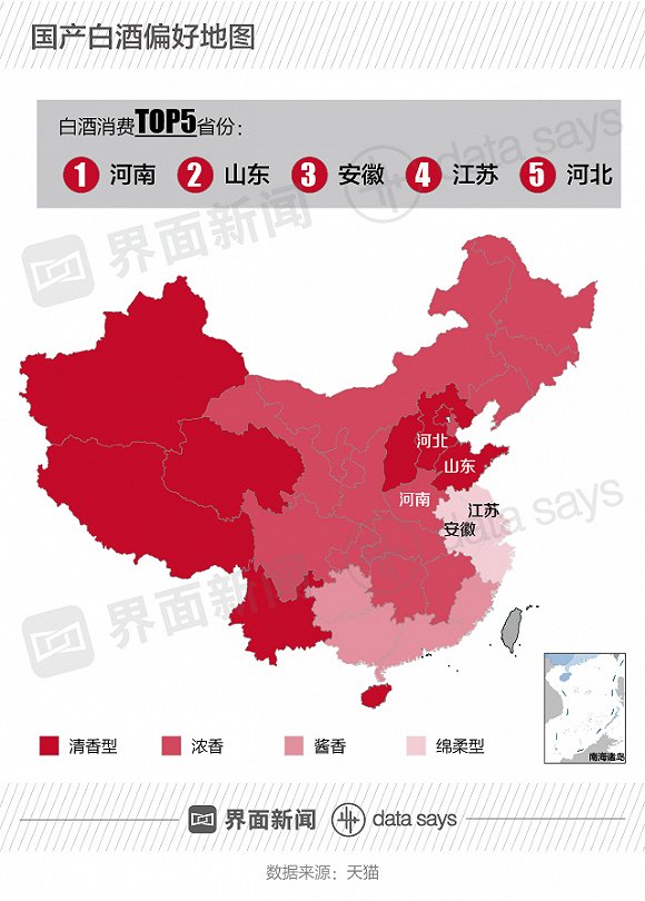 河南、山东、安徽、江苏和河北是白酒消费大省,在这些地区卖得最好的是浓香型、清香型和绵柔型白酒。