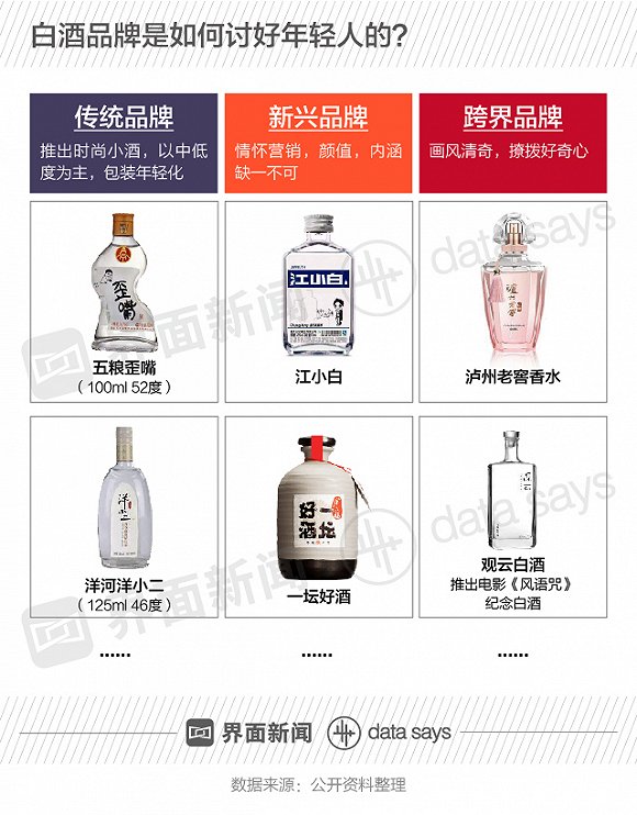 为了卖出更多酒,许多传统白酒品牌都推出新系列,努力迎合年轻一代消费者对低度小瓶白酒的偏好。新兴白酒品牌则是玩营销玩得很溜,从“颜值”到“内涵”,都在极力讨好年轻人。