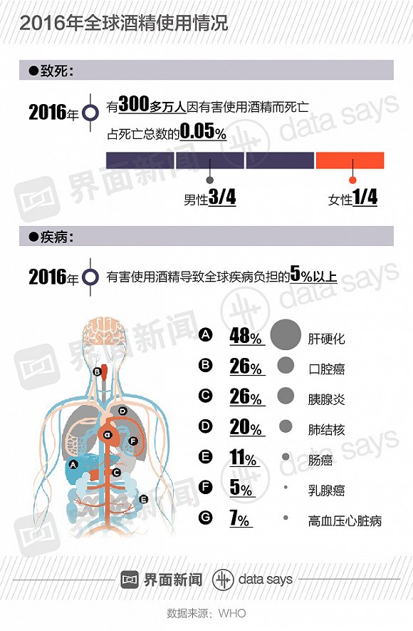 WHO数据显示,2016年有300多万人因有害使用酒精而死亡,平均每20位死亡中就有1人死于饮酒,男性占3/4。此外,饮酒还与200多种健康问题有关,其中肝硬化最为常见。