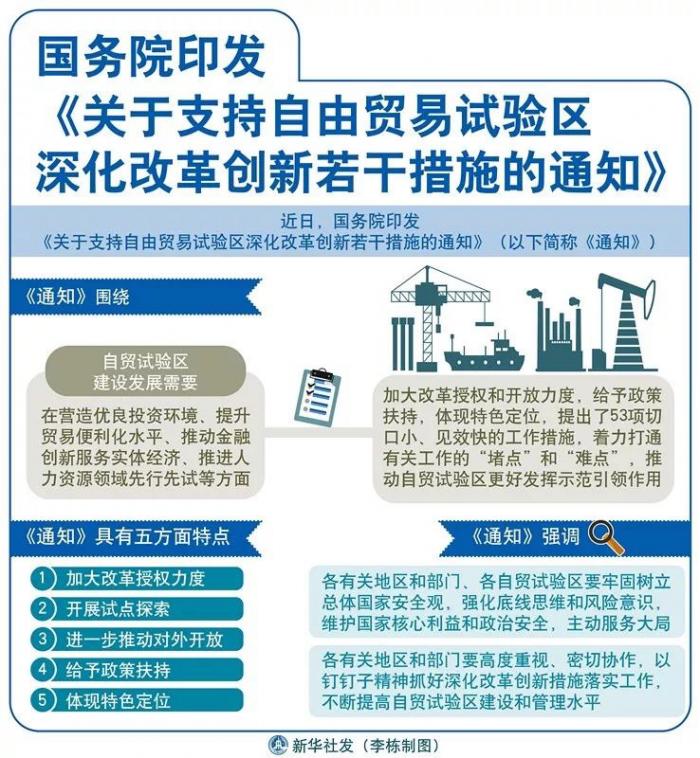 2、国务院印发《关于支持自由贸易试验区深化改革创新若干措施的通知》。主要内容包括营造优良投资环境;提升贸易便利化水平;推动金融创新服务实体经济;推进人力资源领域先行先试等。53项支持措施中有14项适用于特定自贸试验区。