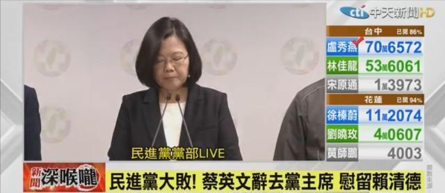 根据新华社消息,蔡英文24日晚间宣布辞去民进党党主席职务,以示对该党在台湾地区“九合一”选举中的表现负责。