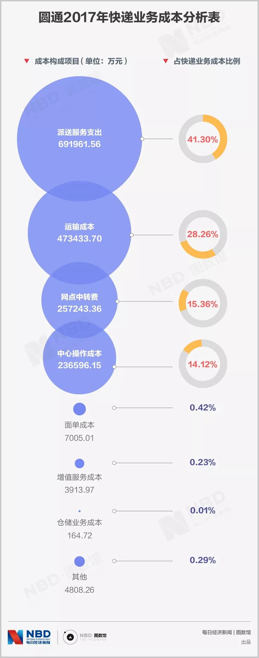 根据圆通2017年年报,其营业成本各项占比如下图。从图中可以看出,各项成本中最高的是运输成本,其次是网点中转费、中心操作成本。