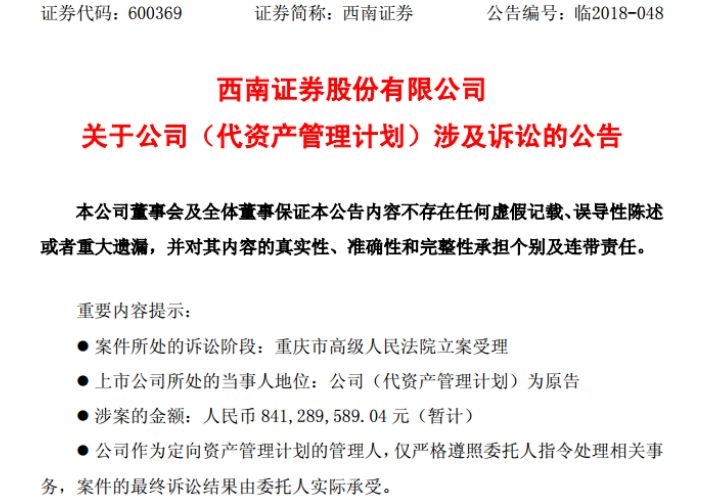 不过,该起诉讼不会影响西南证券业绩表现。